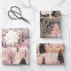 Three elegant pink holiday wrapping paper sheets featuring a delicately illustrated pink village dotted with roaming deer.