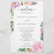 Elégant programme de mariage avec calligraphie manuscrite moderne. Possibilité de modifier et d'ajuster le texte en sélectionnant la personnaliser plus loin. Avant avec les détails de la cérémonie mariage, retour avec les noms de la fête de mariage et message de remerciement pour vos invités. Conception avec un cadre floral d'aquarelle exquis dans un beau mélange de teintes violet, lilas, lavande, rose et pêche. Ambiance moderne et élégante. Une partie de nos collections "Joyful Pastel Floral" ainsi que nos collections "Purple and Pink Joyful Floral", toutes deux avec une variété de produits de coordination disponibles.