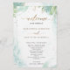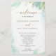 Elégant programme de mariage avec délicat arrière - plan de tache d'aquarelle et verdure haut dans les teintes turquoise, aqua, bleu poussiéreux et vert doux. Détails d'or en feuille, mouchoirs et calligraphie manuscrite moderne. Possibilité de modifier et d'ajuster le texte en sélectionnant la personnaliser plus loin. Avant avec les détails de la cérémonie mariage, retour avec les noms de la fête de mariage et message de remerciement pour vos invités. Ambiance moderne et élégante. Également disponible sans détails de verdure mais en gardant des taches d'aquarelle sur l'arrière - plan. Une partie de notre collection "Airy Blue and Green Watercolor" avec une variété de produits de coordination disponibles.