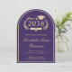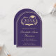 Faire-part de diplôme universitaire violet en forme d'arc avec "Classe de" en or illustration d'une couronne de laurier, d'un casquette et d'un diplôme en or, et le nom du diplômé dans un élégant script en or. Ajoutez leur école, major, distinctions honorifiques ou plans d'avenir dans la typographie classique de la serif d'or.