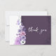 An elegant purple floral wedding thank you card featuring soft watercolor flowers in lavender, blush, and white, accented with delicate botanical line art and a graceful butterfly. The split layout with a deep plum panel and soft floral border creates a romantic and sophisticated look, perfect for sending heartfelt thanks after your wedding celebration. A beautiful choice for couples creating a coordinated floral wedding stationery suite with a feminine purple palette.