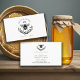 Bienenthema Honig Visitenkarte Design. Elegante Biene und Krone in einem Laurel Kranz Format. Ein schöner rustikaler erdgeschmückter Stil mit schwarzer und goldener Typografie auf weiß. Ein Bienenthema für ein Bienengeschäft, ein Honigwarengeschäft oder jedes Geschäft, das mit Bienensymbolik im Einklang steht.