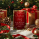 Featuring a rich ruby background adorned with sparkling snowflakes, holly leaves, and golden accents, this festive design perfectly captures the warmth and joy of the holidays.