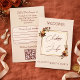 Elegant Romantic Rusty Rose Autumn Wedding Enclosure Card. Invite your guests in style with one of our elegant and romantic fall wedding invitations and this enclosure card. The beautiful design features a delicate gold geometric frame accented by moody watercolor bouquets of burgundy and rust orange roses against a warm cream background. This exquisite stationery includes a convenient QR code registry and RSVP information on the back, making it perfect for modern couples planning a sophisticated autumn celebration.