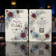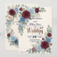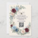 Streamline guest replies with this tech-savvy autumn stationery, featuring rich burgundy and muted blue florals over a faux textured cream background.This formal stationery piece utilizes a printed light cream textured paper effect to ground a balanced composition of deep maroon and dusty blue botanical illustrations. The layout's visual hierarchy highlights a classic serif monogram featuring the initials E and W, framed by printed dimensional layered blossoms, peach buds, small blue filler flowers, and eucalyptus greenery. Deep maroon text and dark navy details in calligraphic script provide crisp, accessible contrast alongside a functional black scannable square.This is a flat printed image with a printed dimensional layered floral and textured paper effect, not actual raised material.