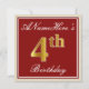 Dieses schlichte und elegante Geburtstagsgeschenk-Design enthält eine personalisierte Botschaft wie "ANameHere’s 4th Birthday" (mit dem "4th" mit einem Imitat/Imitation in goldenem Farblook) in einem rot-farbenen quadratischen Bereich mit einer einfachen Kontur an den Rändern. Der Name ist in einem Text in weißer Schrift und kann personalisiert sein. Die Rückseite bietet individuell anpassbare Einladungsdetails. Eine solche Geburtstagsfeiereinladung könnte vielleicht genutzt werden, um Leute zu einer Geburtstagsparty einzuladen, die für jemanden veranstaltet wird, der seinen vierten Geburtstag feiert. [~Z0000227]