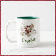 Festliche Tasse mit roten und beigen Blume. Fügen Sie Ihren Namen hinzu, um in dunkelgrün, Schriftzeichen zu personalisieren.