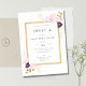 Eucalyptus and myrtle leaves, hand-drawn in classic graphite pencil and layered in gold (digitally), together with watercolor and pencil roses in pink and purple, make for a modern, sophisticated, elegant and chic Sweet 16 invitation template. A lovely choice for a Sweet 16 party with a rustic theme, or a garden theme, or a country chic theme.
