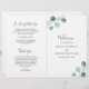 Élégant programme de mariage à budget plié avec un design simple avec aquarelle peinte sauge vert eucalyptus verdure dans le coin supérieur gauche et le coin inférieur droit. Ces programmes de mariage botanique rustique avec une touche moderne sont parfaits pour un mariage de printemps ou d'été.
