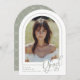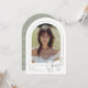 Annoncez votre grad dans le style avec ces annonces de photos élégantes et modernes de la sauge et de la graduation blanche. FRONT : "Grad" est montré dans un script manuscrit tendance et recouvre partiellement la photo en forme d'arc. Personnalisez le modèle avec la photo de votre élève, les prénoms et prénoms, le nom de l'école et les derniers deux chiffres de leur année de graduation. RETOUR : Un motif géométrique avec des arcs simples dessinés à la main. © Kimbellished, LLC