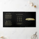 Brochure moderne triplée avec un trait abstrait de peinture or et votre nom dans un élégant script de brosse sur un arrière - plan noir. Le panneau arrière contient vos heures de fonctionnement et vos coordonnées. Le panneau de pliage intérieur comporte deux en-têtes et des zones de texte. L'intérieur a plusieurs modèles pour des informations sur votre entreprise sur les panneaux extérieurs et une liste de prix dans le panneau central. Les deux côtés ont des guides pliants qui peuvent être enlevés en cliquant sur le bouton "personnaliser". Une simple brochure triplée avec une touche féminine, parfaite pour un salon de ongles, salon de beauté ou coiffeur appartenant à une femme.