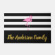 Lass deinen Besuchern, dass sie die richtige Zuhause erreicht haben. Sie können Ihren Familiennamen in Imitate Gold Skript auf dem breiten schwarzen Streifen unten hinzufügen. Der Hintergrund ist schwarz-weiße Streifen. Ein rosa Flamingo liegt über dem Text.