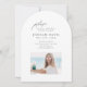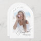 Faire-part de graduation simple en noir et blanc dispose de 2 photos avec script moderne et forme arc, élégant et amusant, Personnalisé avec votre propre photo et informations de la grande fête à l'arrière.