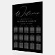 Tableau de sièges mariage moderne avec "Welcome" affiché en haut dans un élégant script de calligraphie blanc avec un arrière - plan acrylique noir. Personnalisez le tableau minimaliste en noir et blanc avec vos noms, votre date de mariage et vos noms d'invités pour vos 15 tables. Le design s'harmonise avec notre collection de mariage Modern Elegant.