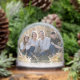 Elegant Script Red Photo Religious Snow Globe with "unto us a child is born" in white script font, pine leaves and stars. Personalize with your photo, name and year.
