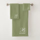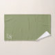 Une élégante serviette verte à la sauge monogrammée avec un script blanc initial, et nom de famille serif. Une couleur d'accent parfaite pour une salle de bain à l'ambiance spa neutre et terrestre.