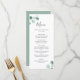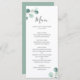Menu de mariage élégant avec un design simple avec aquarelle peinte de la verdure d'eucalyptus dans le coin supérieur gauche et le coin inférieur droit. L'arrière est une teinte assortie de vert sage moyen. Ce menu botanique rustique mariage avec une touche moderne est parfait pour un mariage de printemps ou d'été.