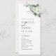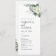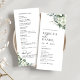 Notre design élégant de mariage verdoyant est parfait pour votre célébration mariage minimaliste. Avec de belles aquarelles Eucalyptus et des illustrations de fleurs blanches, ce design d'inspiration botanique est simple mais chic et crée un gardien sophistiqué de votre journée spéciale. À l'avant sont les détails de votre cérémonie de mariage pour guider vos invités à travers votre cérémonie et au verso sont les détails de votre fête de mariage, avec un message de remerciement pour partager votre appréciation. Entièrement personnalisable avec tous vos propres détails de mariage directement dans l'éditeur Zazzle!