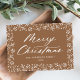 Elegante Urlaubskarte mit "Frohe Weihnachten" in einem fett weißen Kalligrafieschrift mit weißem Schneeflocken und Kiefernzweig auf einem kugelfarbenen Hintergrund. Personalisieren Sie die Vorderseite der Non-Foto-Urlaubskarte, indem Sie Ihren Namen und das Jahr hinzufügen. Auf der Rückseite der modernen Urlaubskarte finden Sie Ihre persönliche Nachricht mit einem schönen Schneeflockenmuster.