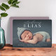 Un élégant design de faire-part de naissance avec un fond plein de saignement photo horizontale ou orientée paysage avec "introduction [nom]" en haut en script de calligraphie blanc chic et lettrage serif classique. Le nom complet de votre bébé, les statistiques de naissance et la signature de votre famille apparaissent en bas. Ajoutez trois photos carrés supplémentaires à l'arrière.