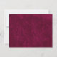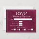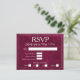 Cette élégante carte de réponse RSVP présente un fond bordeaux profond avec une texture douce de faux-velours et un cadre à double bordure raffiné. Un lettrage serif classique associé à une écriture élégante ajoute une sensation intemporelle, tandis que la mise en page épurée comprend des options de réponse, des sélections de repas et une ligne pour les noms des invités. Parfaite pour les mariages formels, les célébrations en soirée et les suites d'événements sophistiqués, cette carte RSVP se coordonne parfaitement avec des modèles d'invitation luxueux de couleur joyau.