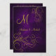 Il s'agit d'un faire-part de mariage élégant et riche avec les prénoms de mariée et de mariée et monogramme en or sur un élégant arrière - plan violet dégradé violet. De jolis tourbillons d'or finissent sur le devant de l'invitation. Le dos tient votre texte mariage en or sur le même arrière - plan violet.