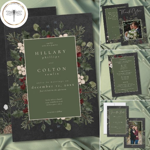 Elegant Winter Berries Pine Black Wedding Photo Save The Date