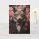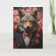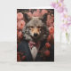 Ein eleganter Wolf in einem Anzug mit rosa Blume, die in den jeden Anlässen die Karte grüßen