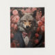 Ein eleganter Wolf in einem Anzug mit rosa Blume