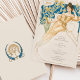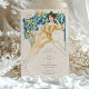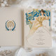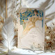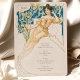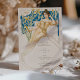 Fügen Sie Ihrer Hochzeit eine Touch Vintagen Charmes hinzu mit dieser wunderschön gestalteten Art Nouveau-inspirierten Getränkekarte. Die Vorderseite zeigt eine atemberaubende Abbildung einer anmutigen Dame in einem ätherisch-goldgelben Ziegenkleid, Set vor einem Hintergrund üppiger Blumenmotive in Blau- und Grüntönen. Auf der raffinierten Speisekarte finden Sie eine Auswahl an Cocktails, Bier, Wein und Spirituosen, die elegant in einer klassischen Schrift aufgeführt sind. Auf der Rückseite ist ein zartes botanisches Emblem in Gold und Blau zu sehen, das eine zusätzliche Eleganz verleiht. Diese Karte ist perfekt für Hochzeiten und andere besondere Anlässe geeignet, um Ihre Gäste zu beeindrucken.