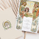 Stärken Sie Ihren Hochzeitsempfang mit unserer eleganten Art Nouveau Wedding Drinks Menu Card. Diese Karte mit exquisiten Illustrationen, die von der Jugendstil-Bewegung inspiriert wurden, zeigt komplexe Blumenmotive und anmutige Figuren in den Farbtönen Gold, Salbei und Korallen. An der Vorderseite der Karte finden Sie eine köstliche Auswahl an Cocktails, Bieren und Weinen, die elegant in einem klassischen Serif-Schriftart präsentiert werden. Der Rücken setzt den Vintagen Charme mit einem wunderschön detaillierten Blumenemblem fort. Ideal, um Ihrem besonderen Tag eine Touch von Eleganz und zeitloser Eleganz hinzuzufügen.