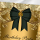 Invitation à la fête d'anniversaire en noir et or avec des tourbillons en or élégant et arc noir. Cette élégante invitation de fête d'anniversaire en noir et or est facilement customisée pour votre événement. Toute occasion de soirée noire et or invitation.