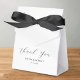 Minimalistische Gastgeschenk Hochzeit-Kästchen mit einem einfachen weißen Hintergrund, einem schwarzen Bogen, den Worten "danke" in einem eleganten Skript-Schriftart, Ihre Namen und das Hochzeitstag.