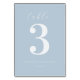 Diese elegante Tischkarte für die Hochzeit zeichnet sich durch ein minimalistisches Design mit einem weichen pastellblauen Hintergrund aus. Das Layout ist sauber und ausgewogen und zeigt eine große Zahl "3" in fetter weißer Schrift in der Mitte, ergänzt durch kursive Schrift für das Wort "Tisch". Anpassbare Namen und Datum werden in einer modernen serifenlosen Schriftart präsentiert, was einen Hauch von Raffinesse verleiht. Die Gesamtstimmung ist ruhig und dezent, perfekt, um eine einladende Atmosphäre auf Ihrem besonderen Ereignis zu schaffen.