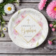 Moderne elegante Girl-Taufpapier-Teller. Das Design besteht aus rosa Blumenelementen mit goldfarbenem Glitzer, vergoldetem Imitat-Folienkreuz und handgeschriebenem Drehbuch ''Taufe'', personalisieren mit einem Namen, Datum.