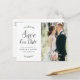 Mit dieser stilvollen Skriptkarte mit botanischen Elementen und einem Foto des Paares verkünden Sie Ihr Hochzeitsdatum. Der Text kann zusammen mit dem schönen Bild bearbeitet werden.