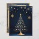 Cette carte de Noël magnifiquement conçue comprend un sapin de Noël élégamment décoré avec des ornements dorés et des lumières, surmonté d'une étoile dorée brillante. L'arbre se dresse en évidence contre un arrière - plan foncé avec des motifs de feuilles subtils et de petites étoiles dorées qui l'entourent. En bas, "Joyeux Noël" est écrit dans un élégant script doré. L'avant de la carte capte l'esprit festif avec son design complexe et festif. Sur le dos, la carte présente une page vierge de style vintage avec des motifs décoratifs, offrant un espace suffisant pour écrire un message personnel et sincère. Parfait pour envoyer des voeux de vacances chaudes à des proches.