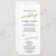 Cet élégant programme de mariage d'or de calligraphie est parfait pour un mariage simple. Le faux décor de feuille d'or est orné d'une carte minimaliste décorée de typographie romantique et fantaisiste. Inclure le nom de la mariée et du marié, la date et le lieu du mariage, le message de remerciement, l'ordre de service, la fête de la mariée et un mémorial optionnel "en mémoire d'amour". Remarque : Ce design ne comporte pas de véritable feuille d'or. C'est un graphisme de haute qualité fait pour ressembler à du papier doré.