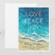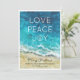 Cartes de noël sur la plage tropicale chaude avec une belle aquarelle de sable doré & l'océan bleu aqua, les mots "amour, paix, joie", vos Joyeuses Fêtes, et nom de famille.