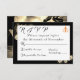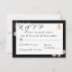 Le design présente un élégant arrière - plan noir avec des roses sépia entourant un rectangle blanc affichant du texte. Le texte est affiché dans le format approprié pour une carte de réponse. Le dos affiche une grande image d'un beau rose sépia contre un arrière - plan noir. Une croix dorée entrelacée de deux anneaux mariages est présentée dans le coin supérieur droit. Le design est très agréable à l'oeil.