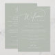 Dieses elegante, grüne Hochzeitsreisemodell eignet sich perfekt für eine einfache Hochzeit. Das moderne minimalistische Design besticht durch zeitlose pastellgrüne und romantische Kalligraphie mit böhmischem Märchenstil. Auf der Vorderseite des Begrüßungstafels befindet sich ein Begrüßungsbrief und auf der Rückseite befindet sich die Zeitachse für die Hochzeitsreise. Diese Noten sind ideal für Hochzeiten in Urlaubsort und Begrüßungstaschen für Hotelgäste.