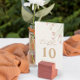 Eine freistehende Tischnummer mit feinen Wildblumen-Illustrationen.