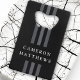 Eleganter, schwarzer Flaschenöffner mit drei dunkelgrauen Linien, die von oben nach unten mit Ihrem Namen durchlaufen.