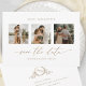 Teilen Sie Ihr Hochzeitstag mit dieser eleganten, drei Foto Save the Date Karte. Einfach Vorlage ausfüllen und die Drucke bestellen! Weißes und goldenes Design mit goldenen Details aus den Imitaten. Zurück mit handgezeichnetem Monogramm in goldenen Imitate-Folie mit Paarinitialen und Bereich für alle Details, die Sie wollen. Möglichkeit, Design zu bearbeiten und Änderungen mit dem Editor-Tool vorzunehmen. Elegant, einfach und stilvoll. Auch das gleiche Design ohne Monogramm auf der Rückseite ist verfügbar. Teil unserer "Elegant Calligraphy Minimalistisch Wedding Stationery" Kollektion mit einer Vielzahl von Produkten zur Koordination, inklusive kompletter Hochzeitseinladungen. Die gesamte Sammlung finden Sie unter: https://www.zazzle.com/collections/elegant_calligraphy_minimalist_wedding_stationery-119497981924462546
