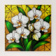 Eine künstlerische Ausstellung mit weißen Orchideen, die in einem lebendigen, farbigen Glaskunststil dargestellt sind, wobei die goldenen Farbtöne im Hintergrund mit üppiger Vegetation hervorgehoben werden. Ideal für Blumenthemen und dekorative Themen.
