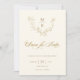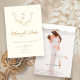 Eleganter und dezenter Klassiker mit handgezeichnet goldblütendfarbenem Kranz mit Platz für Monogramm, benutzerdefinierter Kalligraphie-Schriftzeichen-Grafik und bearbeitbaren Textfeldern. Zurück zeigt Fotovorlage und zusätzliches Textfeld.