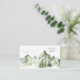 Aquarellmalerei von Bäumen, fliegenden Vögeln und Bergen im Hintergrund. Stille und ruhige Natur-Illustration mit Kiefern und Silhouetten fliegender Vögel. Eine Zeile für den Gastnamen und eine Zeile für die Tischnummer.