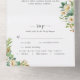 Elegante Grün florale All-in-One Hochzeitseinladung mit perforiertem UAWG. Umweltfreundlich, da keine zusätzlichen Beilagen, RSVP-Karten oder UAWG-Umschläge nötig sind, hat diese Einladung alles! Die Möglichkeit, sowohl Hochzeitsfeier und Empfang Details hinzuzufügen, als auch UAWG postcard bereit für die Gäste zu füllen und zu schicken! Fesselndes Design mit exquisiter Aquarellfarbe Eukalyptusgrün mit weißen, gelben Blumen- und Goldfolienelementen aus Imitat. Moderne handgeschriebene Kalligrafiedetails. Die Option, Einladungen mit gedrucktem (oder handgeschriebenem) Gastnamen oder einer Phrase auf der Rückseite zu bestellen, damit Sie diese ohne Umschläge verschicken können, oder eine persönliche Nachricht oder ein persönliches Angebot hinzufügen können. Das gleiche Einladungs-Design mit Foto im Hintergrund anstelle von Gästennamen oder Zitat auch verfügbar. Das elegante, aber dennoch praktische und Öko-freundliche Ambiente des Hauses überzeugt durch ein eindrucksvolles Design.