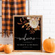 Dieses elegante Hochzeitszeichen besticht durch handbemalte Aquarellfarben in Orange und Terrakotta, cremefarbene und beige Dahlien und wunderschöne rostfarbene Rose auf schwarzem Hintergrund mit cremefarbenem Text. Finden Sie passende Artikel in der Black Herbst Romance Collection.