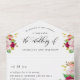 Freuen Sie sich auf diese elegante blumengeschmückte Einladung zum Hochzeitsfest mit perforiertem UAWG. Umweltfreundliche Einladung, da keine zusätzlichen Beilagen, RSVP-Karten oder UAWG-Umschläge nötig sind, diese Einladung hat alles! Die Möglichkeit, sowohl Hochzeitsfeier und Empfang Details hinzuzufügen, als auch UAWG postcard bereit für die Gäste zu füllen und zu schicken! Fesselndes Design mit exquisiten Aquarellfarben-Blumenelementen in einer schönen Mischung aus Rot, Rot, Rosa, Weiß, Pfirsich, Gelb, Senf und Weizen. Moderne handgeschriebene Kalligrafiedetails. Die Option, Einladungen mit gedrucktem (oder handgeschriebenem) Gastnamen oder einer Phrase auf der Rückseite zu bestellen, damit Sie diese ohne Umschläge verschicken können, oder eine persönliche Nachricht oder ein persönliches Angebot hinzufügen können. Das gleiche Einladungs-Design mit Foto im Hintergrund anstelle von Gästennamen oder Zitat auch verfügbar. Das elegante, aber dennoch praktische und Öko-freundliche Ambiente des Hauses überzeugt durch ein eindrucksvolles Design.